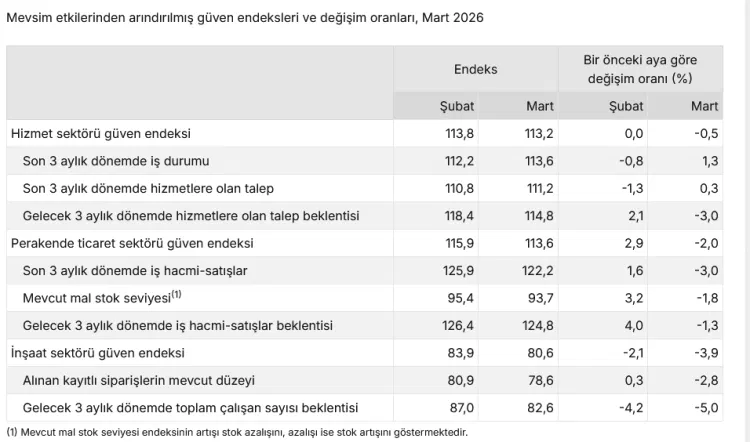 ANKARA (İGFA) - Türkiye İstatistik Kurumu (TÜİK), Mart 2026 dönemi mevsim etkilerinden arındırılmış güven endekslerini açıkladı. Buna göre; hizmet sektöründe güven endeksi yüzde 0,5 azalarak 113,2, perakende ticarette yüzde 2,0 düşüşle 113,6 ve inşaat sektöründe yüzde 3,9 azalarak 80,6 değerini aldı.